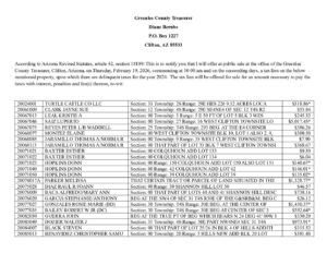 February 4, 2026 By Adam Neveau Comment off 2026 TAX LIEN SALE WEB POSTING Previous 2026 01 JANUARY GREENLEE MONTHLY CASH BALANCES REPORT Next 2026 Primary Date Change General Election Dates